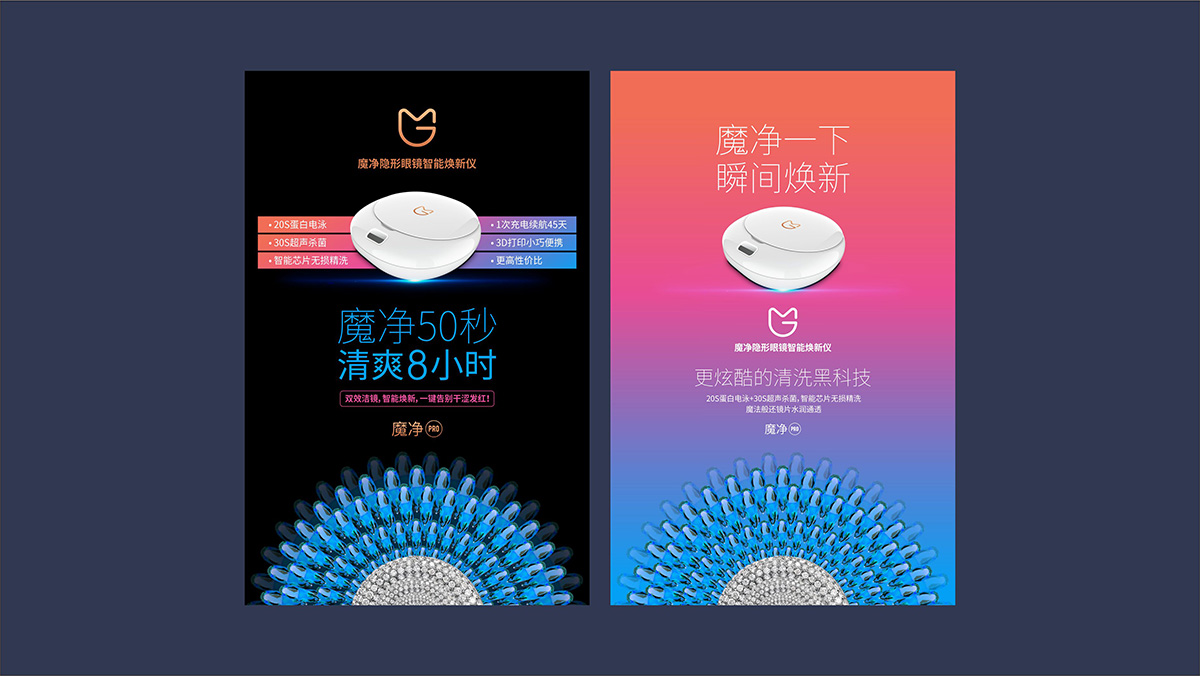 禾松通(tōng)過系統研究,将品牌命名爲“魔淨” Magiclean,新品命名爲“魔淨隐形眼鏡智能煥新儀”,以“魔淨一下(xià),瞬間煥新”的(de)産品slogan,建立了(le)“更炫酷的(de)清洗黑(hēi)科技”的(de)差異化(huà)定位,發掘“20秒蛋白電泳+30超聲去污殺菌”的(de)雙重潔淨功能,策劃放大(dà)“魔淨50秒,清爽一整天”的(de)核心賣點。塑造一款徹底解決用(yòng)戶痛點,填補市場(chǎng)空白的(de)産品。
